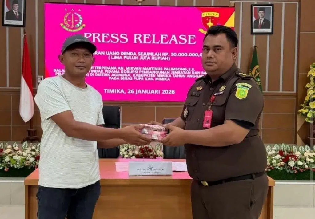 Mimika — Kejaksaan Negeri (Kejari) Mimika melalui Seksi Tindak Pidana Khusus menerima pembayaran uang denda sebesar Rp50.000.000 dari terpidana Mirvan Marthinus Palimbong (MMP) dalam perkara tindak pidana korupsi pembangunan jembatan di Distrik Agimuga, Kabupaten Mimika.