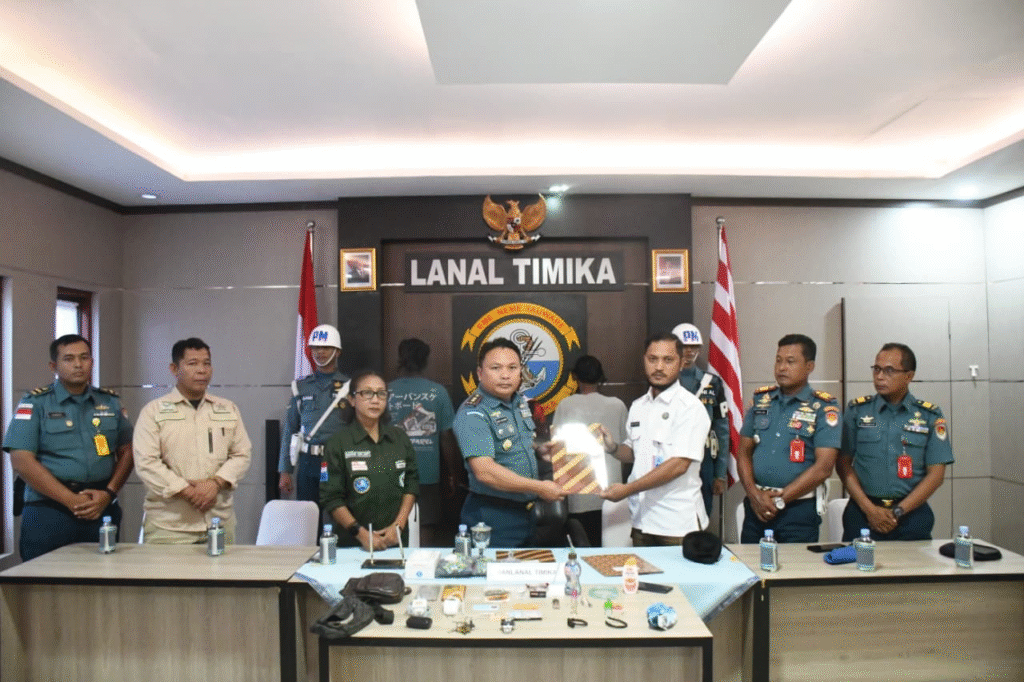 TIMIKA — Pangkalan TNI Angkatan Laut (Lanal) Timika menyerahkan tiga tersangka kasus peredaran narkotika beserta barang bukti hasil penangkapan di Pelabuhan Perikanan Pomako, Distrik Mimika Timur, kepada Polres Mimika.