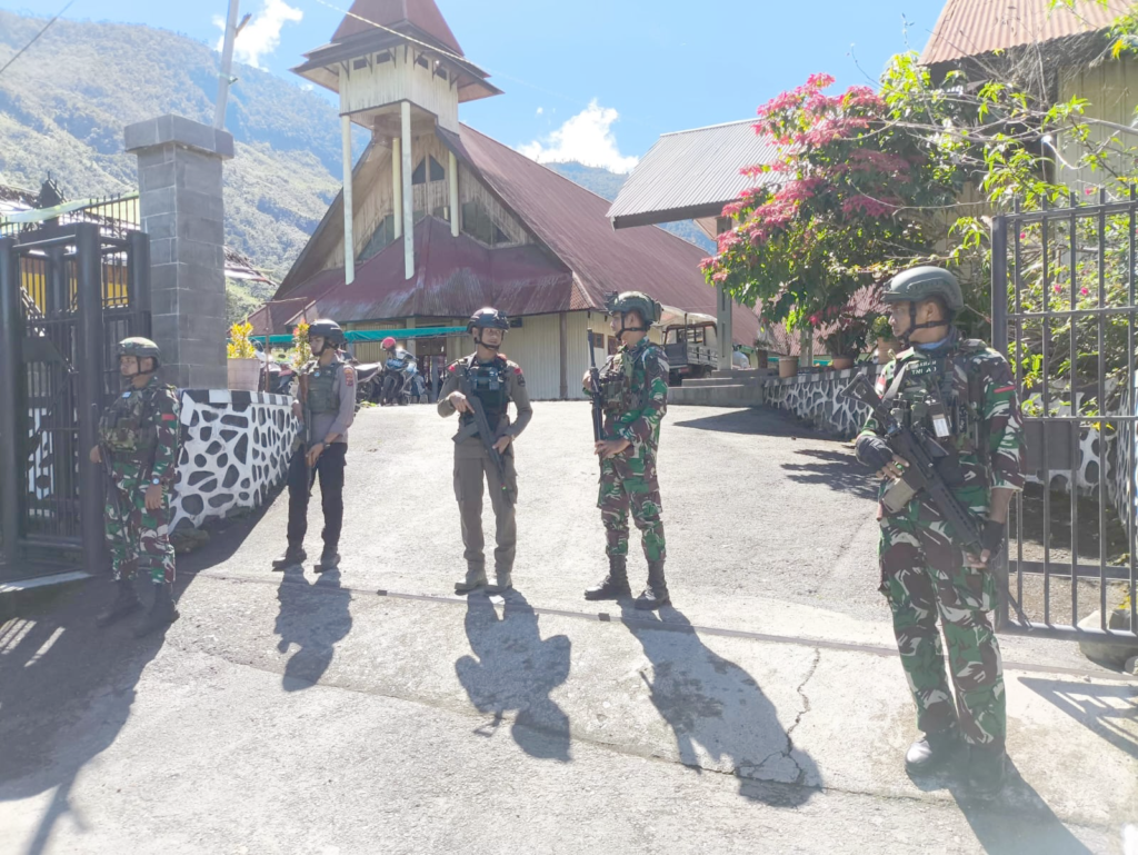 Papua Tengah.News – Sesuai arahan dari Mabes TNI dan Mabes Polri, seluruh jajaran TNI-Polri melaksanakan pengamanan Jumat Agung di Indonesia. Khusus di Puncak Jaya, Papua Tengah, Satuan Tugas Pengamanan Perbatasan Batalyon Infanteri (Satgas Pamtas Yonif) 715/Motuliato bersama aparat kepolisian setempat turun langsung ke Gereja Kristen Injili (GKI) Puncak Jaya.